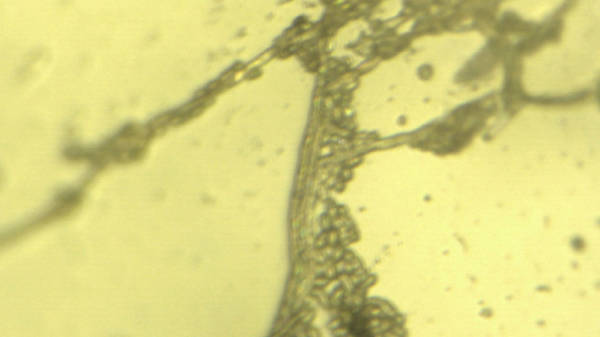 Under the microscope, this sample — take from a plastic sheet covering tomato plants on her property — showed a multitude of strange biological structures… things that resemble tiny eggs, bacterial colonies, fungal structures, algal features and more. The microscopy photos below reveal some of the details. The most zoomed-in photos are taken at a magnification of around 2000x.